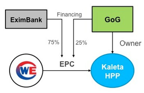 In 2011, the Government of Guinea concluded an EPC contract with China International Water and Electric Company (CWE) for the construction of Kaléta Hydropower scheme. The Exim Bank of China provided a sovereign credit for 85% of the EPC contract value, while the Government of Guinea provided 15% of the EPC contract value and covered the costs of the supervision contract, the environmental and social management measures and the interest during construction: overall 25% of the total costs of the project.