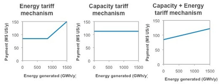 - The Energy tariff mechanism, the billing is based on the energy effectively generated which is multiplied by the energy tariff. In this particular hydropower context, a floor was set at the level of firm energy multiplied by the energy tariff.
