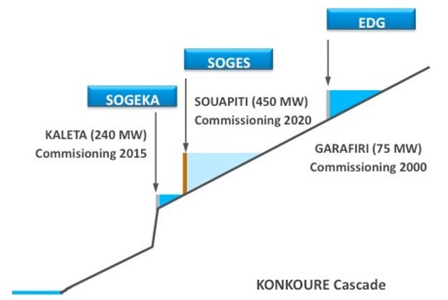 The three HPP in cascade over the Konkoure river (Garafiri, Souapiti, Kaleta) will be managed by three different operators while they are influencing and constraining each other’s operation. The aim of the coordinated management contract between EDG – SOGES – SOGEKA is to ensure the optimization of the cascade operation as a collective national resource.