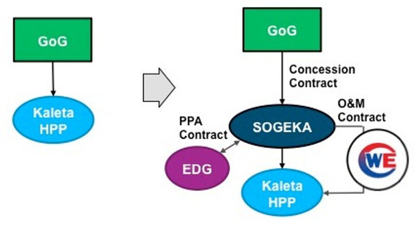 To summarize, at its creation, the GoG is the owner of the SOGEKA company, created to ensure the operation of the generation and transmission assets of Kaleta and the commercialization of the public services associated to them. The SOGEKA operates the infrastructure through an O&M contract with CWE and sells the generated electricity to EDG under the PPA contractual conditions as summarized below.